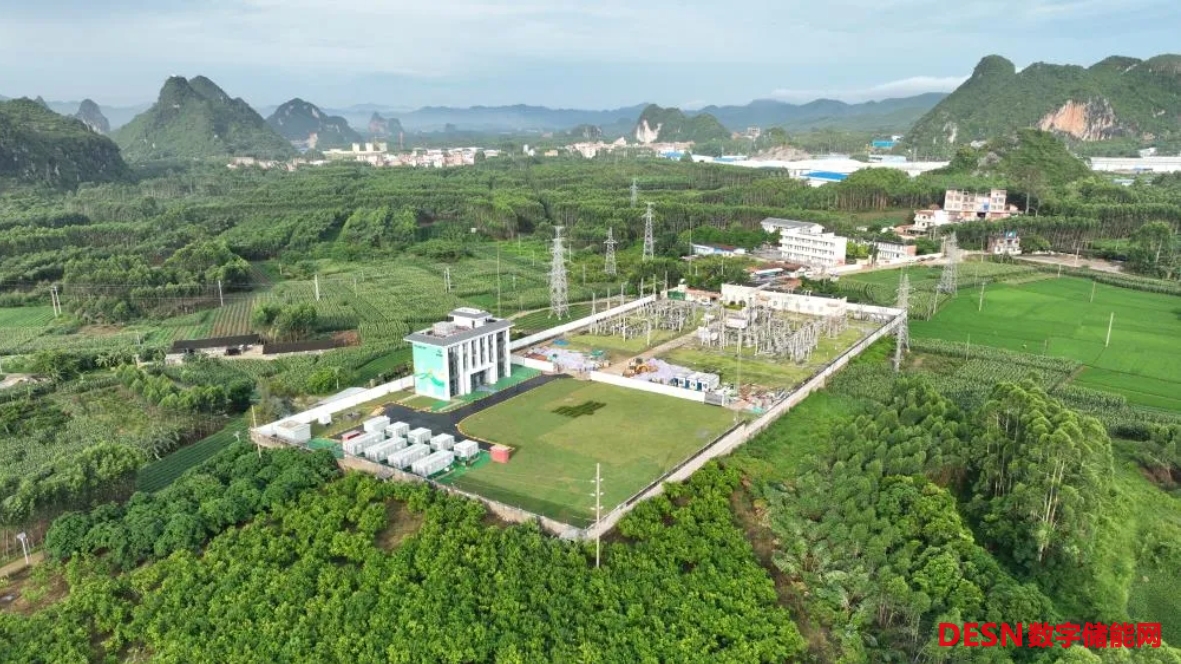 在南寧市武鳴區(qū),兩排看似彩色集裝箱的電池艙和變流器艙整齊排列,與右側(cè)墻壁涂有綠色元素繪畫的3層中控大樓相映矗立。