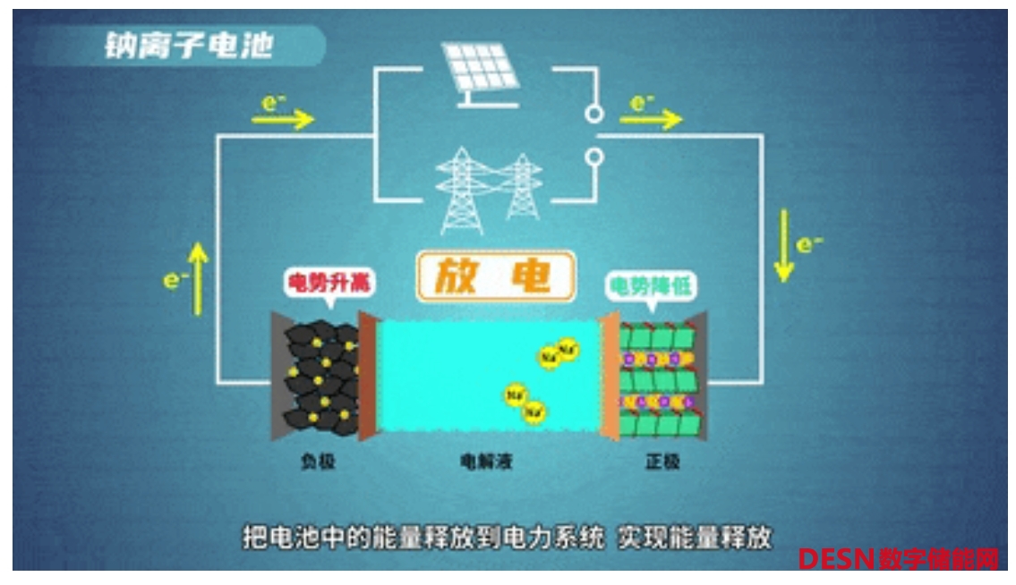 放電時,鈉離子運動方向與充電過程相反,正極電勢降低,負極電勢升高,把電池中的能量釋放到電力系統(tǒng),實現(xiàn)能量釋放。