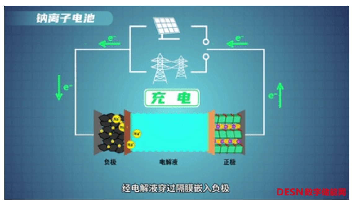 充電時,鈉離子從電池正極脫出,經(jīng)電解液穿過隔膜嵌入負極,正極電勢升高,負極電勢降低,把能量儲存到電池中,實現(xiàn)能量存儲。