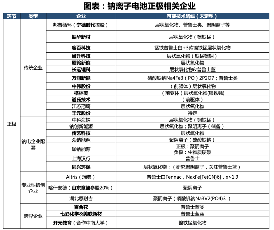 三條正極材料路線(xiàn)中,普魯士藍(lán)類(lèi)似物是鈉電池的特有體系,需要特定的產(chǎn)業(yè)化配套,層狀金屬氧化物和聚陰離子化合物分別與三元電池和磷酸鐵鋰電池同體系,均有良好的產(chǎn)業(yè)化基礎(chǔ),傳統(tǒng)鋰電廠(chǎng)、正極材料廠(chǎng)商、專(zhuān)注鈉電研究的科創(chuàng)型團(tuán)隊(duì)在鈉電正極方面均有布局,進(jìn)展順利。