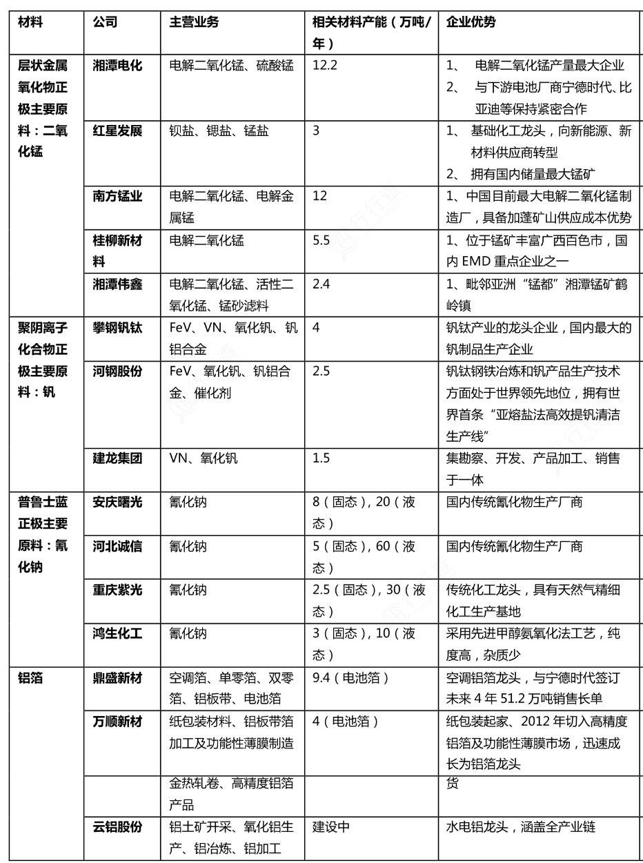 鈉離子電池產(chǎn)業(yè)鏈?zhǔn)巧嫌卧牧稀O嚓P(guān)企業(yè)主要包括攀鋼釩鈦、河鋼股份、建龍集團(tuán)和華陽(yáng)股份等;鋁箔企業(yè)包括鼎盛新材、萬(wàn)順新材、南山鋁業(yè)和云鋁股份等;氰化鈉相關(guān)企業(yè)包括安慶曙光、河北誠(chéng)信、重慶紫光等;二氧化錳相關(guān)企業(yè)包括湘潭電化、紅星發(fā)展等。