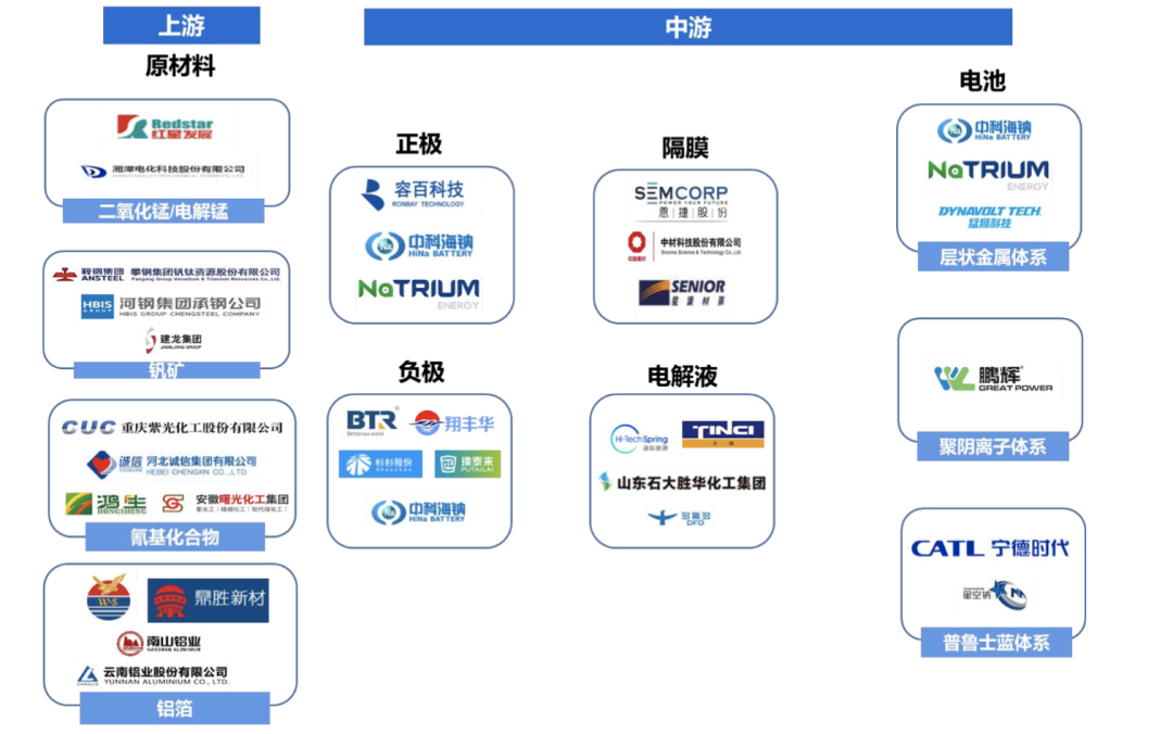 鈉離子電池產(chǎn)業(yè)鏈結(jié)構(gòu)與鋰電類(lèi)似,包括上游資源企業(yè)、中游電池材料及電池電芯企業(yè)。