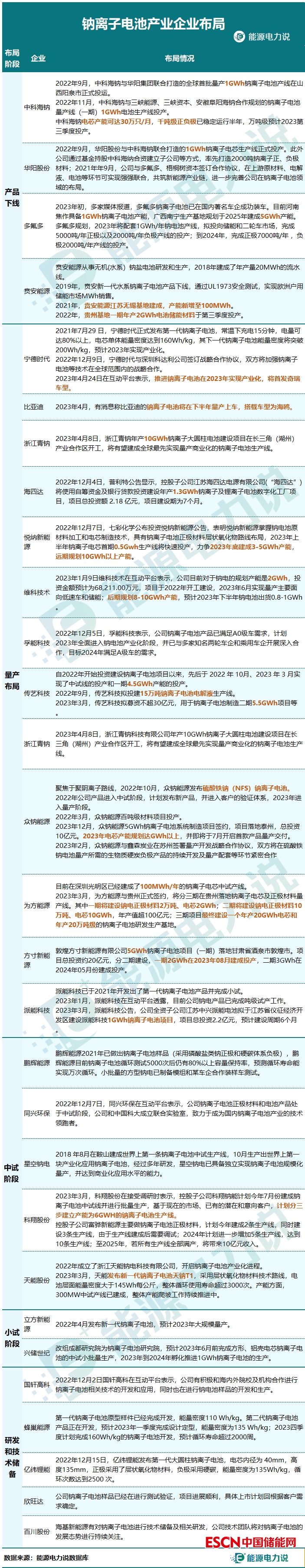 鈉離子電池在新技術(shù)突破、產(chǎn)能、應(yīng)用等方面都在逐步展開(kāi)。2023年,被認(rèn)為是中國(guó)鈉離子電池產(chǎn)業(yè)化關(guān)鍵年,眾多國(guó)家及地方政策明確要支持發(fā)展鈉離子電池、液流電池等多元化技術(shù)路線,國(guó)內(nèi)已率先實(shí)現(xiàn)材料和電芯的量產(chǎn)。各大企業(yè)紛紛涌入,隨著產(chǎn)能的迅速鋪開(kāi),鈉離子電池產(chǎn)業(yè)鏈正在逐步成型。