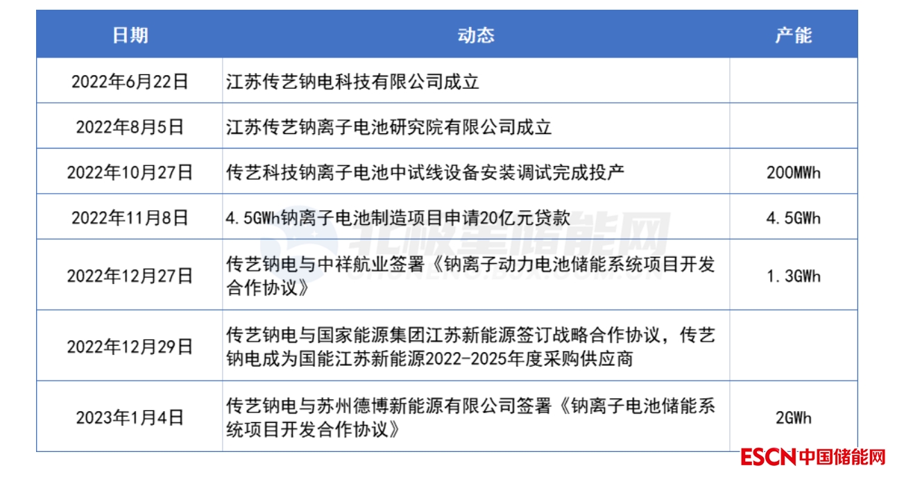 行業(yè)的興起吸引多家企業(yè)入局鈉電,據(jù)了解,江蘇傳藝科技股份有限公司是一家從事電腦鍵盤制造的A股上市企業(yè),于2007年成立,以2022年6月成立鈉離子電池企業(yè)為標(biāo)志,傳藝科技正式跨界入局儲(chǔ)能。不料此后的半年,傳藝科技快速拓展,頻頻斬獲大單,與航空公司、電力央企等有實(shí)力的企業(yè)簽約供應(yīng)協(xié)議。
