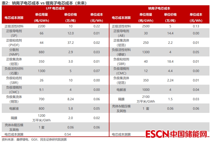 未來隨著碳酸鋰價格回落,鈉離子電池產(chǎn)業(yè)鏈成熟。假設(shè)碳酸鋰價格未來降低到 25 萬/噸左右,根據(jù)鑫欏鋰電,25 萬/噸的碳酸鋰對應(yīng)磷酸鐵鋰正極價格約10 萬/噸,鈉離子電池方面,我們假設(shè)鈉離子電池正極、負極產(chǎn)業(yè)鏈成熟后成本可降低 50%,根據(jù)測算,未來碳酸鋰價格回落, 鈉離子電池產(chǎn)業(yè)鏈成熟后,磷酸鐵鋰電芯的成本約 0.54 元/Wh,鈉離子電芯的成本約 0.33 元/Wh,鈉離子電芯成本低于磷酸鐵鋰電芯 0.21 元/Wh。