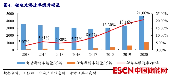 電動(dòng)車市場上,鉛酸電池被替代已成趨勢。新版《電動(dòng)自行車安全技術(shù)規(guī)范》自2019年4月15日正式實(shí)施,規(guī)定電動(dòng)自行車整車質(zhì)量不得超過55kg,超標(biāo)車型或換用質(zhì)量更輕的鋰電池(中低端鋰電池能量密度約為鉛酸電池的4倍),或申請(qǐng)電動(dòng)摩托車目錄成為機(jī)動(dòng)車(消費(fèi)者需要相關(guān)駕照,并且額外增加上牌費(fèi)、年檢費(fèi)、保險(xiǎn)費(fèi)等額外費(fèi)用),或退出電動(dòng)車市場。目前鋰電池滲透率不斷提高,鉛酸電池將被快速取代。