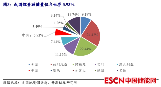 我國擁有世界鋰資源儲(chǔ)量的5.93%,但是開發(fā)困難,鋰礦對(duì)外依存度高。據(jù)中國地質(zhì)調(diào)查局?jǐn)?shù)據(jù)顯示,我國大部分鋰礦資源分布在青藏高原等自然環(huán)境惡劣和基礎(chǔ)設(shè)施落后的地區(qū),所以開采難度很大。有86.8%的鹵水鋰資源位于青海柴達(dá)木地區(qū)和藏北地區(qū),60.5%的硬巖鋰位于四川西部地區(qū)。受制于提鋰技術(shù)、地理環(huán)境、交通條件等,難以形成規(guī)?;a(chǎn)。巨大的需求量和規(guī)?;a(chǎn)難度,使我國鋰礦主要依賴進(jìn)口,據(jù)中國地質(zhì)調(diào)查局,我國原礦對(duì)外依存度高達(dá)76%。