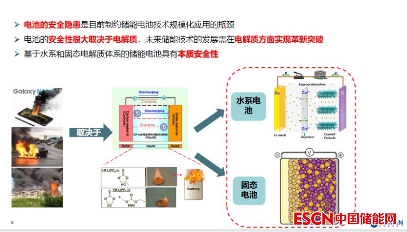 鋰電池的安全提升技術(shù)流線,大家公認(rèn)的就是固態(tài)電池,像日本的豐田,中國的蜂巢、清陶已經(jīng)投入了大量資源去研究固態(tài)鋰離子電池。固態(tài)鋰離子電池的隔膜是固態(tài),所以不會(huì)存在著鋰枝晶穿透隔膜到達(dá)正極引發(fā)短路的情況,從而產(chǎn)生熱失控的風(fēng)險(xiǎn),這是從基理上解決這個(gè)問題。另一種研究路徑是水系電池,因?yàn)樗惦姵刈鲭娊庖?,采用自來水或者是去離子水,或者有些無機(jī)電解質(zhì)鹽,水的比容量是很高的。這也是從電解液的本質(zhì)來解決電池的安全問題。