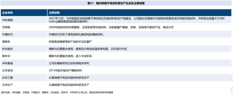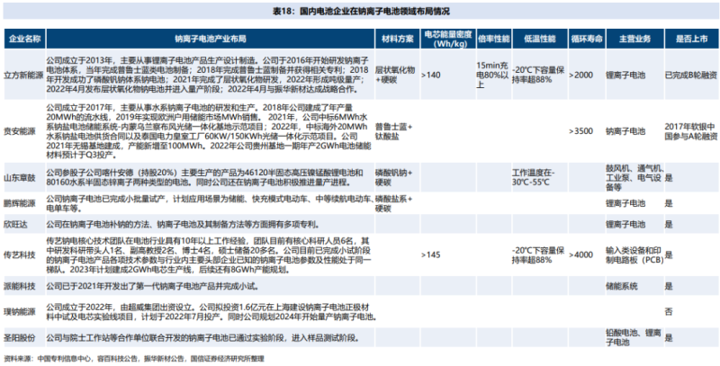 國內(nèi)企業(yè)里,中科海鈉、立方新能源等企業(yè)均已實(shí)現(xiàn)量產(chǎn),寧德時代等企業(yè)也在積極推進(jìn)鈉離子電池產(chǎn)業(yè)化,蜂巢能源、億緯鋰能、國軒高科、欣旺達(dá)、派能科技等傳統(tǒng)鋰離子電池企業(yè)也已具備相關(guān)技術(shù)布局。