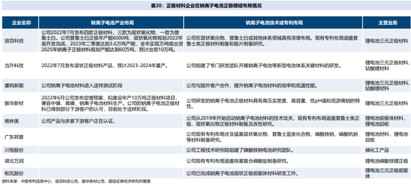 鈉離子電池正極材料布局方面,容百科技已具備初步量產(chǎn)能力,振華新材已開始進(jìn)行相關(guān)產(chǎn)能建設(shè),當(dāng)升科技、格林美、廣東邦普等均具有相關(guān)專利布局,并且積極推進(jìn)產(chǎn)業(yè)化進(jìn)程。