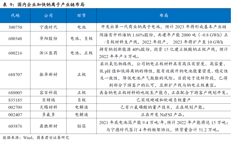 目前鈉離子電池的技術(shù)成熟度尚不及鋰離子電池,處于導(dǎo)入期向成長(zhǎng)期過(guò)渡階段,尚未形成產(chǎn)業(yè)規(guī)模,多種技術(shù)并行發(fā)展,且技術(shù)壁壘較高。我們認(rèn)為在碳酸鋰價(jià)格居高不下的背景下,鈉離子電池的成本優(yōu)勢(shì)將更為顯著,同時(shí)我們看到隨著新能源裝機(jī)規(guī)模帶來(lái)的儲(chǔ)能需求以及海外戶(hù)用儲(chǔ)能的發(fā)展,鈉離子電池的成長(zhǎng)空間將進(jìn)一步打開(kāi)。目前來(lái)看電池、正極、負(fù)極等核心材料國(guó)內(nèi)產(chǎn)業(yè)鏈均有相關(guān)企業(yè)布局。