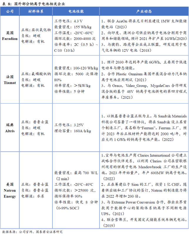 國(guó)外的鈉離子電池企業(yè)主要分布?xì)W美和日本等發(fā)達(dá)國(guó)家,各種材料體系和技術(shù)路線(xiàn)均有公司采用,這些企業(yè)大都創(chuàng)立時(shí)間較短且生產(chǎn)規(guī)模有限,但是技術(shù)前瞻性很強(qiáng)。