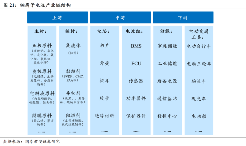鈉離子電池產(chǎn)業(yè)鏈與鋰離子電池類(lèi)似,包含上游、中游、下游三個(gè)部分。上游:原材料供給和電極材料合成,主要原材料包括純堿、鋁箔、錳礦等,以及各類(lèi)輔材,涉及基礎(chǔ)化工和有色金屬等產(chǎn)業(yè)。中游:電芯封裝、電池系統(tǒng)構(gòu)建與集成等,涉及各類(lèi)耗材和電子元器件。下游:終端應(yīng)用市場(chǎng),主要包括儲(chǔ)能和低速電動(dòng)交通工具等。