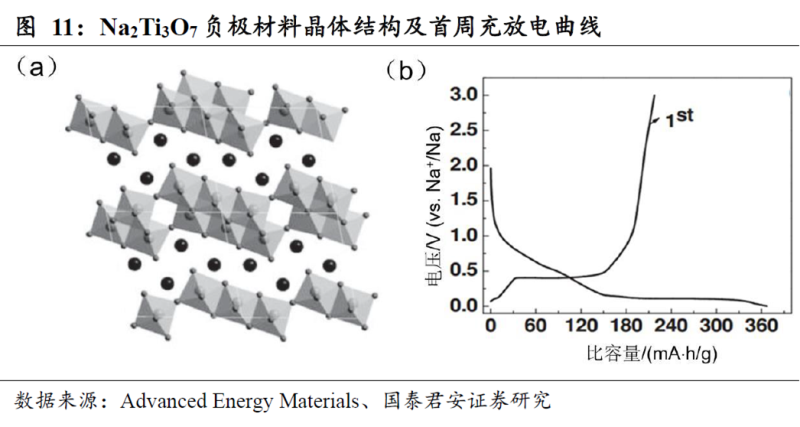 四價(jià)鈦的還原電勢(shì)普遍較低,其化合物空氣穩(wěn)定,且不同晶體結(jié)構(gòu)的鈦化合物儲(chǔ)鈉電勢(shì)不同,因此被用來(lái)開(kāi)發(fā)負(fù)極材料。目前,鈦基材料主要是一些鈦的氧化物和聚陰離子化合物。氧化物包括層狀的Na2Ti3O7、Na0.6[Cr0.6Ti0.4]O2以及尖晶石型的Li4Ti5O12(也被用于鋰離子電池負(fù)極)等,聚陰離子化合物包括正交型的NaTiOPO4、NASICON型的NaTi2(PO4)3。這些材料的比容量普遍不高,但具有很多獨(dú)特的優(yōu)勢(shì),例如Li4Ti5O12是一種無(wú)應(yīng)變材料,Na0.6[Cr0.6Ti0.4]O2可以同時(shí)充當(dāng)正負(fù)極材料,NaTi2(PO4)3可以用于水系鈉離子電池。