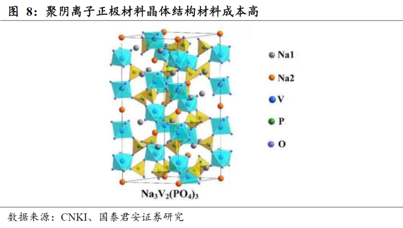 聚陰離子類(lèi)正極材料是指晶體框架由一系列四面體和多面體陰離子單元構(gòu)筑的含鈉復(fù)鹽,通式為NaxMy(XaOb)zZw。,其中M為過(guò)渡金屬或堿土金屬等陽(yáng)離子,X為磷或硫等較高電負(fù)性元素,Z為氟或氫氧根等陰離子。這類(lèi)材料的陰離子多面體單元之間具有很強(qiáng)的共價(jià)鍵合,因此晶體結(jié)構(gòu)非常穩(wěn)固,其化學(xué)穩(wěn)定性、熱穩(wěn)定性以及電化學(xué)穩(wěn)定性都很高,故而具有很好的循環(huán)壽命和安全性,而且其電壓平臺(tái)往往較寬。其次,過(guò)渡金屬離子的價(jià)電子局域化程度高,這種電子結(jié)構(gòu)容易利用強(qiáng)電負(fù)性元素的誘導(dǎo)效應(yīng)來(lái)提升材料的工作電壓。但也因?yàn)槠鋵拵短匦?,?dǎo)致本征電子電導(dǎo)率很低,這極大限制了其倍率性能,必須通過(guò)添加導(dǎo)電劑或者納米化進(jìn)行改性。此外,該材料的比容量普遍較低。目前,最典型的聚陰離子材料主要是磷酸鹽,以橄欖石型的NaFePO4和NASICON型的Na3V2(PO4)3為代表。NaFePO4的結(jié)構(gòu)與磷酸鐵鋰相同,但合成必須依賴(lài)復(fù)雜的離子交換法,成本較高。Na3V2(PO4)3具有極好的倍率性能和循環(huán)壽命,但比容量較橄欖石型材料低。此外,還有焦磷酸鹽、硫酸鹽、鉬酸鹽等新型聚陰離子材料也在研究中,這些體系在工作電壓、倍率性能上有所提升,但仍然存在實(shí)際比容量低、循環(huán)可逆性差等諸多缺陷。