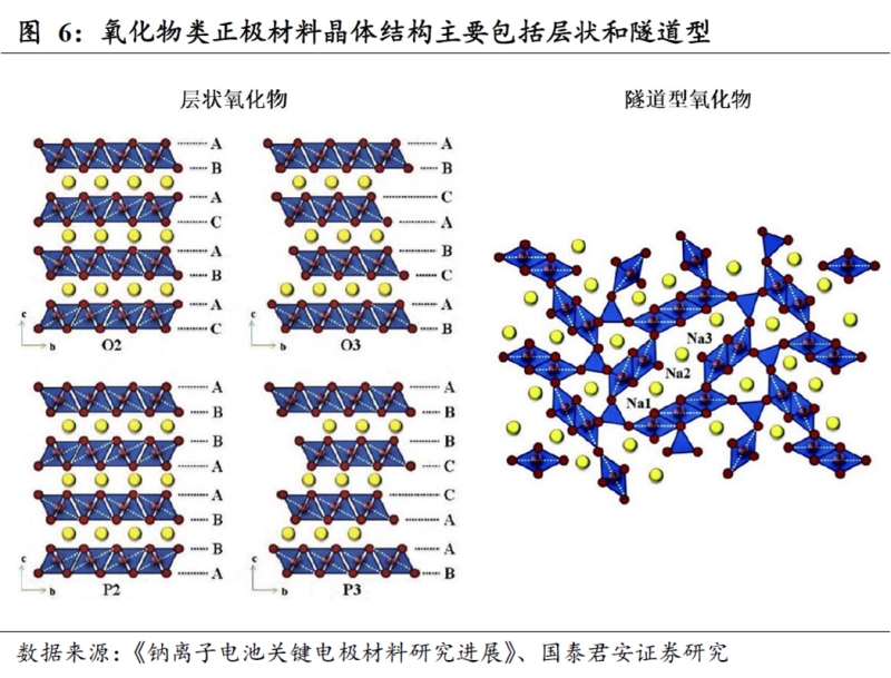 氧化物類(lèi)正極材料一般為過(guò)渡金屬氧化物,主要包括層狀結(jié)構(gòu)氧化物和隧道結(jié)構(gòu)氧化物。層狀氧化物的研究最早也最廣泛,相比于鋰離子電池僅Mn、Co、Ni三種元素的層狀氧化物正極具有可逆電化學(xué)活性,鈉離子電池的選擇范圍更廣,第四周期從Ti至Ni的過(guò)渡金屬都具有高活性,其工作機(jī)理也更為復(fù)雜,常伴隨多種相變行為。層狀氧化物通式為NaxMO2,其中M為過(guò)渡金屬,常見(jiàn)結(jié)構(gòu)類(lèi)型主要包括O3型和P2型,前者的比容量較高但倍率、循環(huán)性能往往較差;后者的倍率、循環(huán)性能較好,但實(shí)際比容量略低。此外,層狀氧化物往往在空氣中易發(fā)生吸濕水解?,F(xiàn)階段,層狀氧化物的能量密度較高、制備工藝成熟,有望率先產(chǎn)業(yè)化,尤其是穩(wěn)定性較好的P2型層狀氧化物。隧道型氧化物具有三維孔道結(jié)構(gòu),往往出現(xiàn)于低鈉含量的氧化物中,具有優(yōu)異的循環(huán)、倍率性能且對(duì)水氧穩(wěn)定,但比容量過(guò)低。未來(lái),隧道型氧化物在富鈉正極以及水系鈉離子電池的研發(fā)中可能具有潛在的競(jìng)爭(zhēng)優(yōu)勢(shì)。