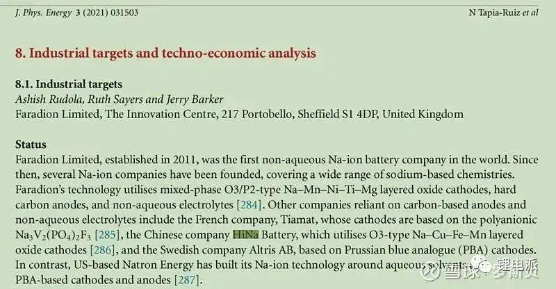 根據(jù)文獻(xiàn)和相關(guān)資訊調(diào)研,目前公認(rèn)的世界范圍內(nèi)的鈉離子電池生產(chǎn)商主要為中國的中科海納(HiNa)、英國的Faradion、法國的Tiamat。例如,德國的IEK9電化學(xué)實驗室2020年關(guān)于鈉離子電池的綜述論文中提到的三家鈉離子電池公司:Faradion、Tiamat、Hina(圖4);英國蘭卡斯特大學(xué)、劍橋大學(xué)、Faradion鈉離子電池公司等多個機(jī)構(gòu)的科學(xué)家聯(lián)合撰寫的論文《2021年鈉離子電池的路線圖》中提到的鈉離子電池公司(圖5)以及德國Institute for Solid State Research研究所等機(jī)構(gòu) 2021年發(fā)表在Nature Reviews Materials( 影響因子 71.189 )的關(guān)于鈉離子電池綜述文章中提及的幾家鈉離子電池生產(chǎn)商(圖6)均包括HiNA(中科海納)。也有文獻(xiàn)將Faradion、Tiamat、Hina列為目前全球最領(lǐng)先的三家鈉離子電池生產(chǎn)商。