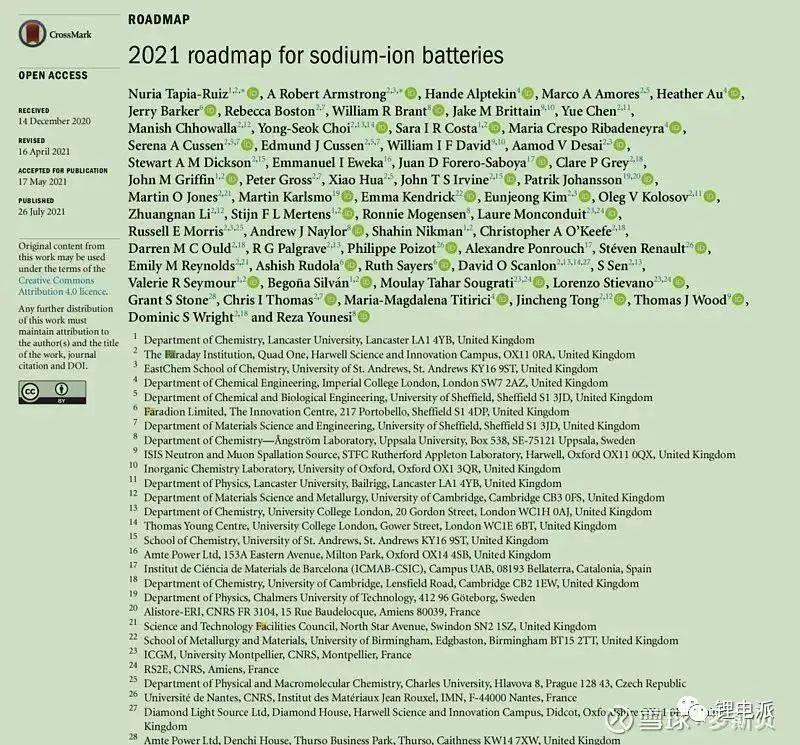 圖5 英國蘭卡斯特大學(xué)/劍橋大學(xué)/Faradion鈉離子電池公司等多個機(jī)構(gòu)的科學(xué)家聯(lián)合撰寫的論文《2021年鈉離子電池的路線圖》
