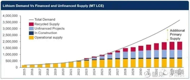 圖1 2015-2035年鋰資源的需求量(黑色線條)和產(chǎn)量(柱狀圖)