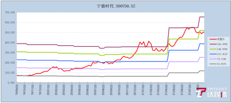 考慮到公司未來的成長性,我們用PEG方法對公司股價進行一下分析,可以看到公司PE(TTM)從2020年以來保持了快速的增長,目前PE較7月份有所下降,目前在144左右,公司2021年上半年凈利潤增速為148.38%, 如果僅是根據(jù)上半年凈利潤增速來看,PEG小于1,以目前凈利潤的增速是對股價有支撐的,但是考慮到未來三五年內(nèi)公司凈利潤維持如此高的增速基本是很困難的,這也就說明市場目前對公司的估值其實是相當(dāng)樂觀的,或許寧德時代已經(jīng)考慮到這一點,而目前積極開發(fā)鈉電池,尋找新的利潤增長點正是主要的應(yīng)對措施之一。