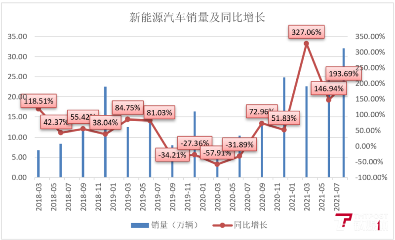 這個得從行業(yè)發(fā)展空間以及寧德時代在行業(yè)中地位如何來進行判斷,從行業(yè)發(fā)展空間來看,動力電池行業(yè)未來的增速取決于下游新能源汽車行業(yè)的增速,國內(nèi)新能源汽車銷量從2020年下半年以來銷量保持高速增長,2021年8月銷量達到32.1萬輛,同比增長193.69%,新能源汽車滲透率2021年8月達到18%,2021年前8個月新能源汽車滲透率達到10.79%,新能源汽車滲透率呈現(xiàn)加速上升的趨勢,2016年到2020年底新能源汽車滲透率從1%上升至不到6%,2021年前8個月滲透率達到10.79%,未來一段時間內(nèi)新能源汽車滲透率仍然會呈現(xiàn)出加速上漲的趨勢。