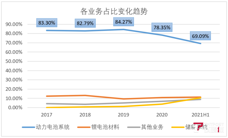 作為拉動營收增長主要的動力電池系統(tǒng)業(yè)務(wù)部分,雖然2021年上半年收入有較大幅度增長,但其對營收的貢獻比例下降至69.09%, 鋰電材料與儲能系統(tǒng)對營收貢獻率均超過10%。