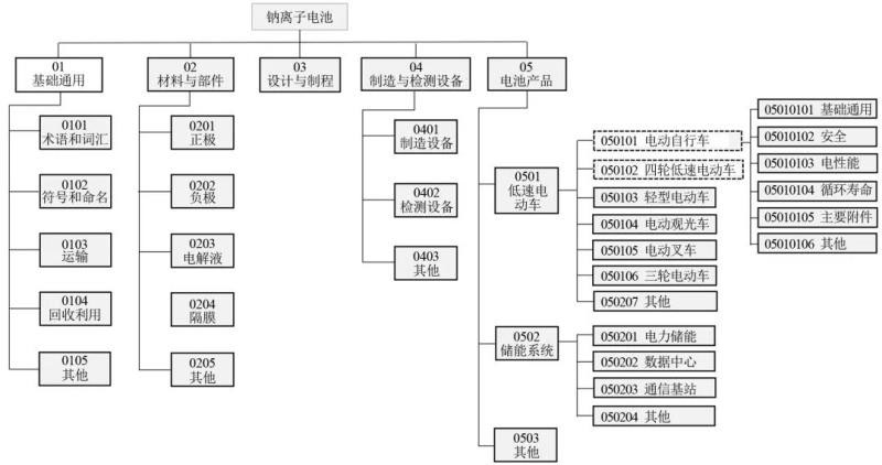 2016年11月,工信部正式發(fā)布了《鋰離子電池綜合標準化技術體系》,首次將鋰離子電池及類似產品的標準化工作納入了統(tǒng)一的宏觀規(guī)劃。該技術體系將鋰離子電池及類似產品的標準分為了5種:基礎通用、材料與部件、設計與制程、制造與檢測設備以及電池產品。而作為鋰離子電池的類似產品,鈉離子電池在其標準化建設時也可借鑒鋰離子電池的方式建立對應的標準技術體系框架(圖5),完善其標準體系布局。