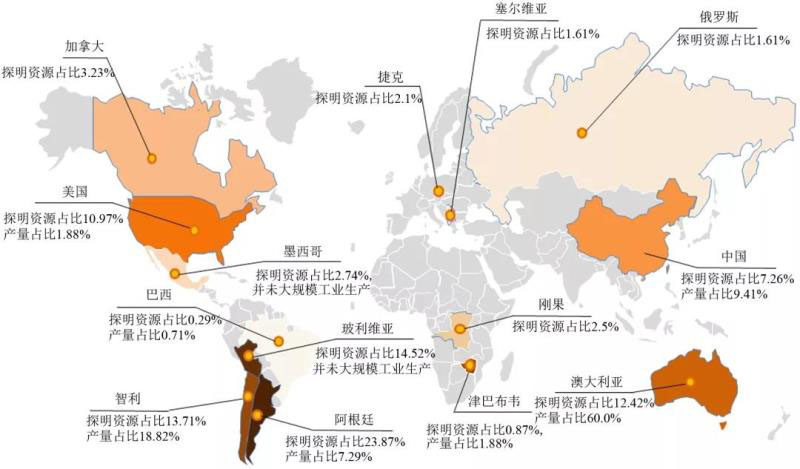 圖2 世界主要鋰資源國家的探明儲量和產量占比