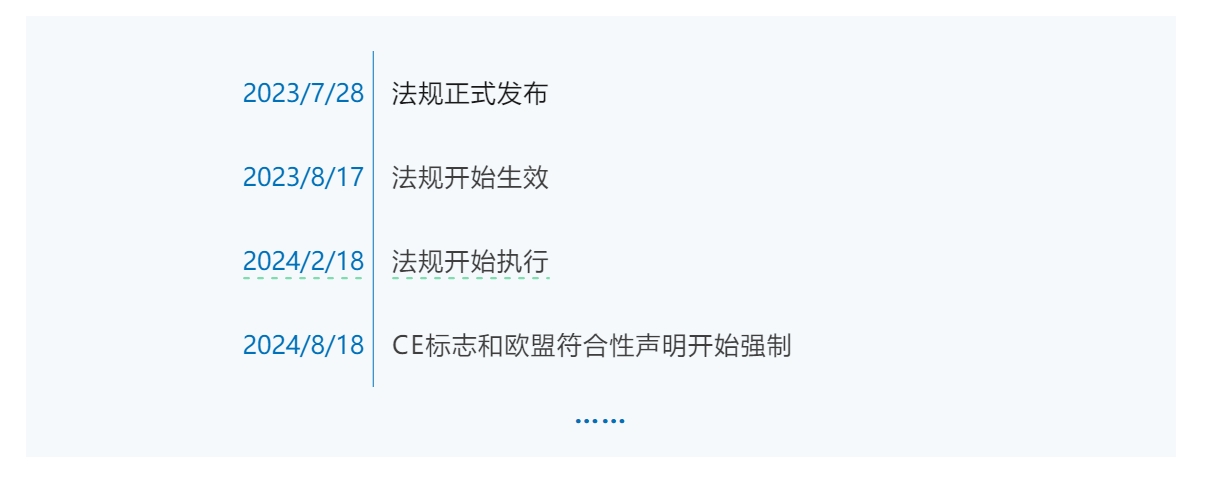 歐盟電池法規(guī)(EU) 2023/1542 實施時間規(guī)劃表: