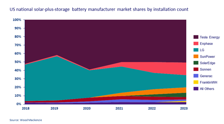 在過去五年中,特斯拉的Powerwall和LG的RESU系列是在美國最受歡迎的住宅儲能系統(tǒng),從2018年到2023年第三季度,這兩家公司的住宅儲能系統(tǒng)占據(jù)了77%市場份額。然而,這兩家公司的主導(dǎo)地位最近受到了市場新進入者的壓力。2018年,美國96%的住宅太陽能+儲能項目配套部署了特斯拉和LG公司的住宅儲能系統(tǒng),而到2023年第三季度,這一比例已經(jīng)降到65%。