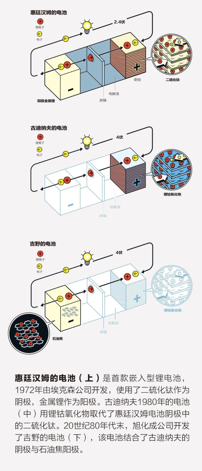 惠廷漢姆的電池與之前的任何電池都不同。其工作原理是將離子插入電極材料主體的原子晶格中,該過程稱為嵌入。其性能也前所未有:既可充電,又具有很高的能量輸出。在此之前,最好的可充電電池是鎳鎘電池,其最大輸出電壓為1.3伏。與之相比,惠廷漢姆的新化學(xué)電池的輸出達到了驚人的2.4伏。