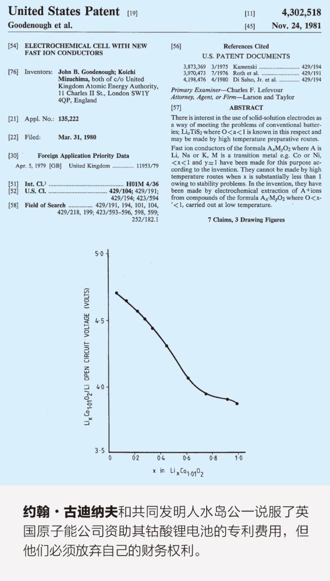 盡管如此,古迪納夫?qū)ψ约旱碾姵鼗瘜W(xué)技術(shù)仍然信心十足。他參觀了英國原子能研究所(AERE),這是一家政府實驗室,位于距牛津大學(xué)約20公里的哈維爾。該實驗室同意為其專利提供資金,前提是這位59歲的科學(xué)家和他的共同發(fā)明人水島簽署協(xié)議,放棄其財務(wù)權(quán)利。兩人同意了這一條件。實驗室于1981年獲得專利;古迪納夫從未得到過有關(guān)原始電池的任何收益。