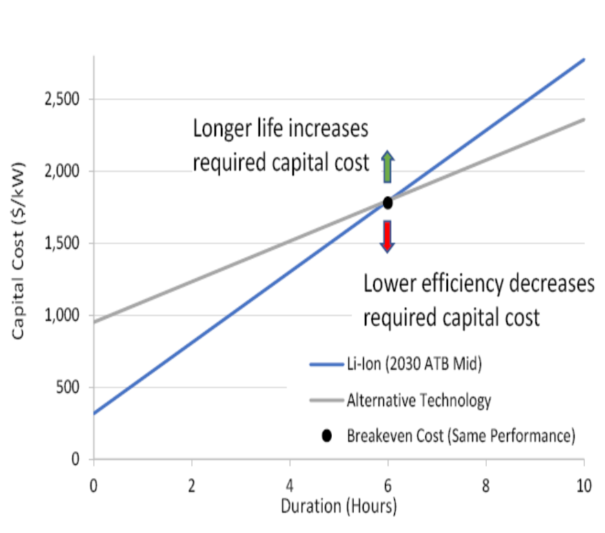 其他曲線顯示了長時儲能系統(tǒng)性能的盈虧平衡條件,包括更長的工作壽命和更低的充放電效率。如上所述,將鋰離子電池儲能系統(tǒng)作為參考,盈虧平衡意味著長時儲能系統(tǒng)的成本必須等于或低于三種不同效率水平。總的來說,即使效率較低,長時儲能系統(tǒng)在其生命周期中的成本仍可能與鋰離子電池儲能系統(tǒng)持平。