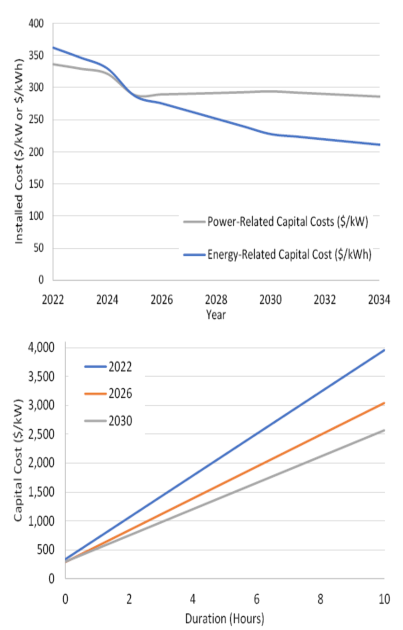 圖15(上圖)顯示了對鋰離子電池儲能系統(tǒng)2023年投資成本的估計。儲能系統(tǒng)的總投資成本(以美元/kW為單位,這是衡量發(fā)電成本的標(biāo)準(zhǔn))如圖15(下圖)所示。曲線的斜率表示與儲能容量相關(guān)的成本,隨著時間的推移,預(yù)期成本的降低會降低成本曲線的斜率。應(yīng)該指出的是,由于面臨供應(yīng)鏈問題,造成了電池儲能系統(tǒng)成本的大幅波動。