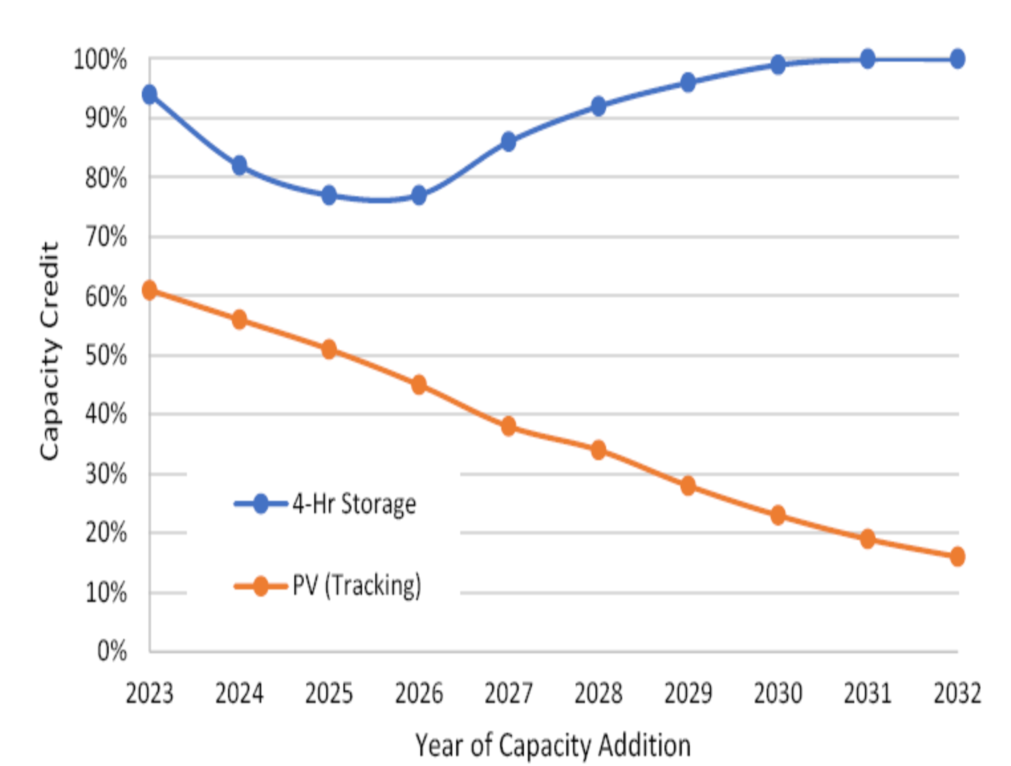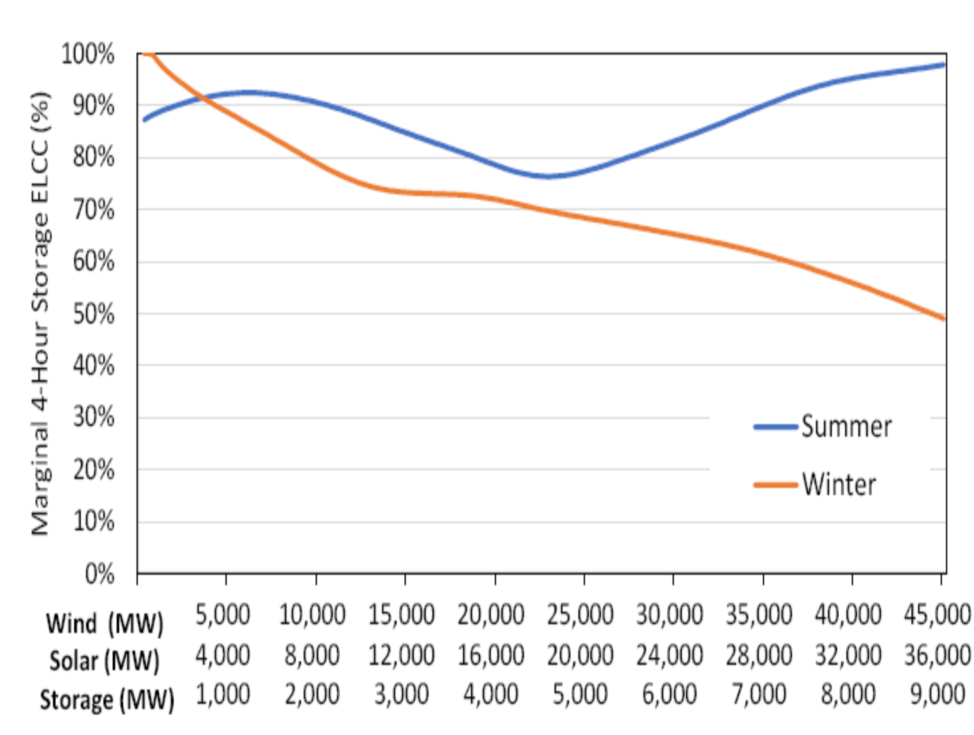 圖9. 在PJM公司服務(wù)區(qū)域部署的太陽能發(fā)電設(shè)施的增長降低了ELCC,同時大幅增加了4小時儲能系統(tǒng)的ELCC,保持了其提供穩(wěn)定容量的能力。