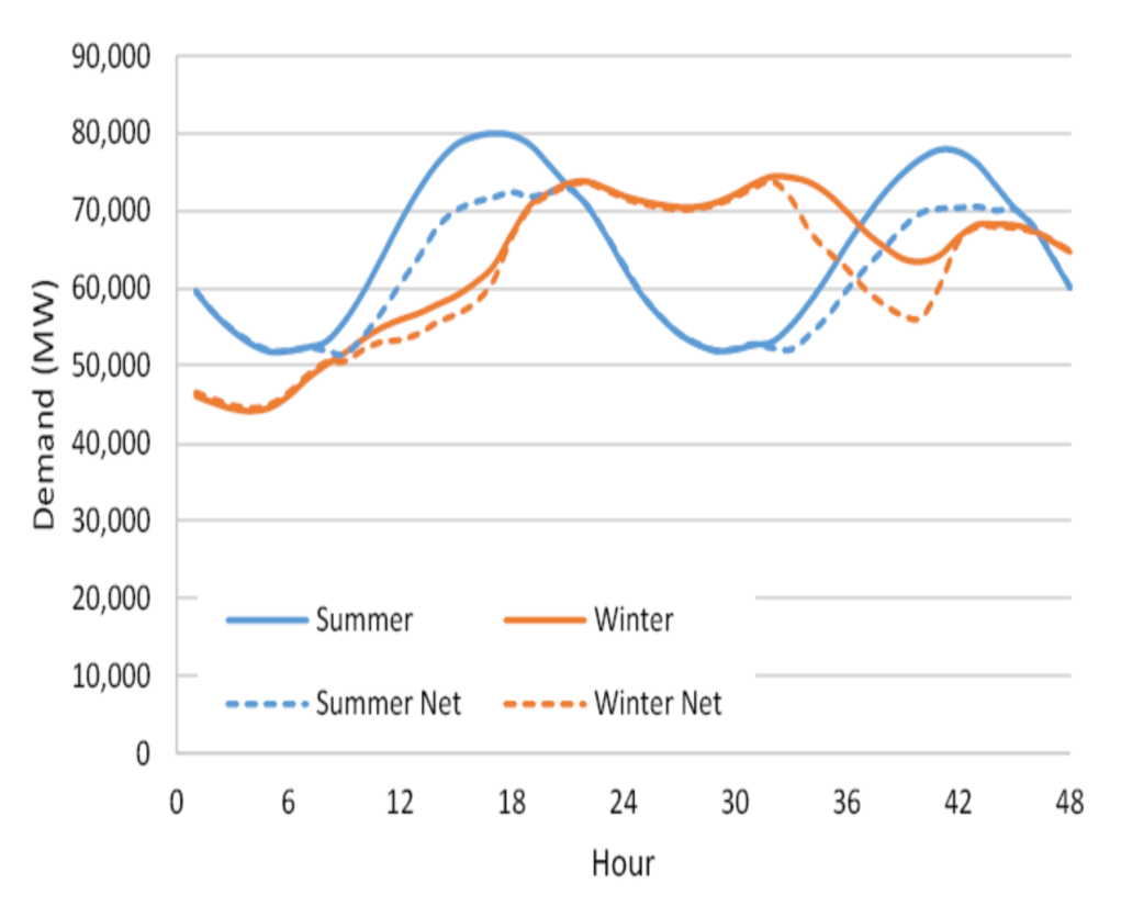即使采用ELCC方法,4小時儲能系統(tǒng)在夏季峰值電力需求期間的容量價值也非常接近100%。更大的影響將是由于電網(wǎng)結(jié)構(gòu)的變化而導(dǎo)致凈負(fù)荷曲線的變化。