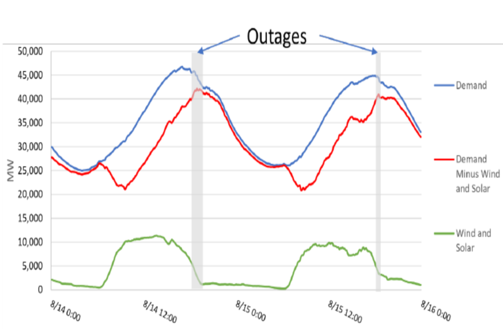 在一些研究案例中,4小時儲能系統(tǒng)解決夏季峰值電力需求的潛力已經(jīng)得到了證明。圖8顯示了2020年8月14日和15日期間加州對太陽能發(fā)電和風(fēng)力發(fā)電的需求(藍(lán)色曲線),其中極端高溫以及其他幾個因素導(dǎo)致了加州輪流停電。8月14日和8月15日分別中斷了2.5小時和1.5小時。具有足夠電力的4小時(或更短)的儲能系統(tǒng)可以提供足夠的電力來避免停電。