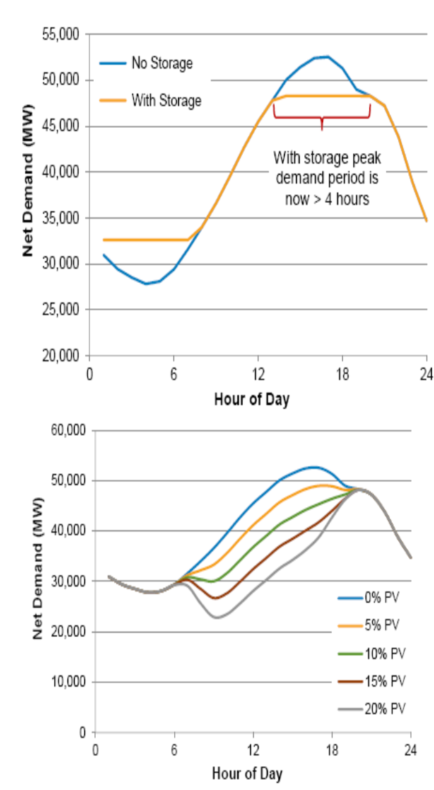 圖7.加利福尼亞州增加4小時儲能部署對凈負(fù)載曲線的模擬影響。演示了儲能系統(tǒng)如何降低峰值需求,但也使其峰值期間變得更長(上圖)。峰值期間的延長可以通過增加太陽能發(fā)電量(下圖)來滿足