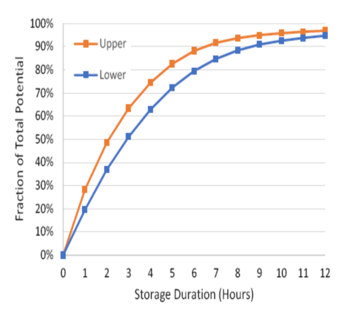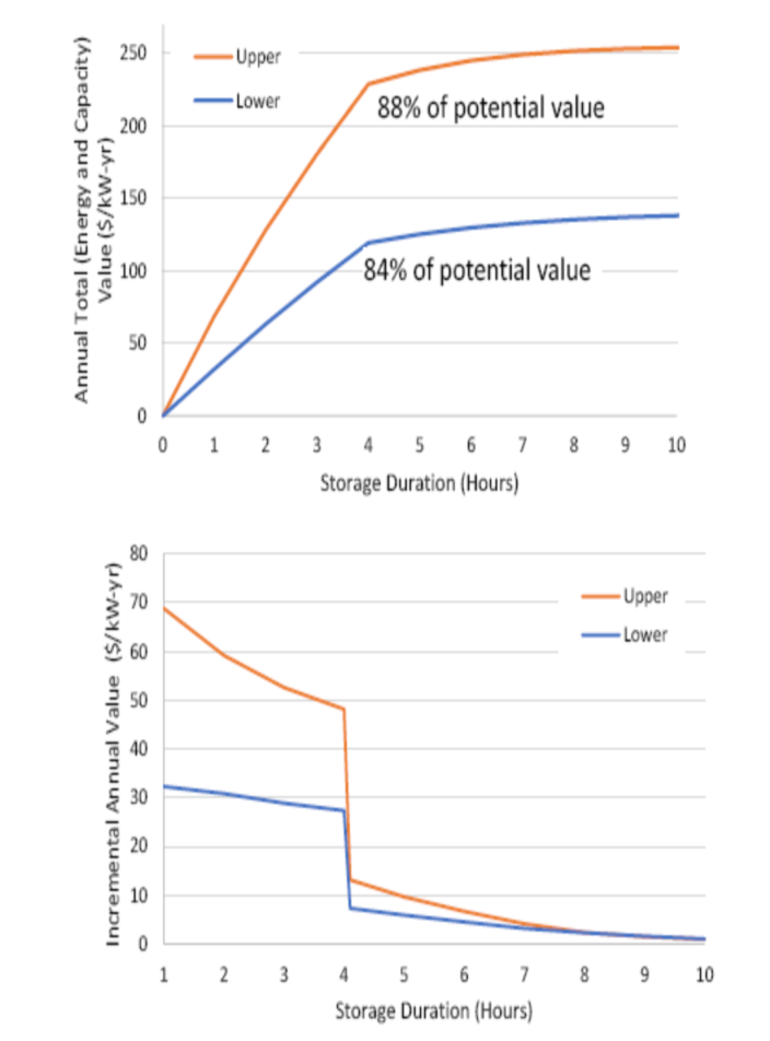 使用容量服務(wù)和能量時移的估計值,圖4(上圖)提供了容量服務(wù)和能量時移組合每年獲得的價值(美元/kW/年)作為持續(xù)時間函數(shù)的范圍。假設(shè)采用4小時容量規(guī)則,并使用兩個容量的值進(jìn)行計算:較低的值為80美元/kW/年,較高的值為150美元/kW/年。這與圖3中的能量時移曲線的價值相結(jié)合,使用較低的值(60美元/kW/年)和較高的值(120美元/kW/年)。4小時儲能系統(tǒng)顯示的值為84%至88%,因此它代表容量服務(wù)(100%)和能量時移(約62%至75%)的加權(quán)平均值。