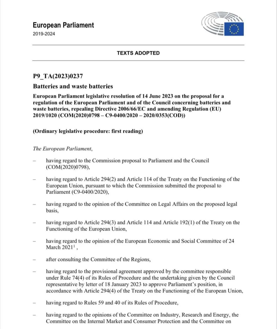 《歐盟電池法》前述部分用143條列出了立法的背景與原因,以及立法的過程,闡明了歐盟的觀點。