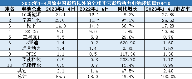 市占率方面,除中國(guó)市場(chǎng)以外的全球其它市場(chǎng)動(dòng)力電池裝機(jī)量TOP10排行榜中,中國(guó)企業(yè)1-4月總體市占率為31.7%,較1-3月的30.6%提高1.1個(gè)百分點(diǎn);同比2022年1-4月24.4%的市占率提高7.3個(gè)百分點(diǎn)。這表明,包括寧德時(shí)代在內(nèi)的中國(guó)企業(yè),在除中國(guó)市場(chǎng)以外的全球其它市場(chǎng)的裝機(jī)量呈現(xiàn)明顯、持續(xù)的增長(zhǎng)態(tài)勢(shì)。