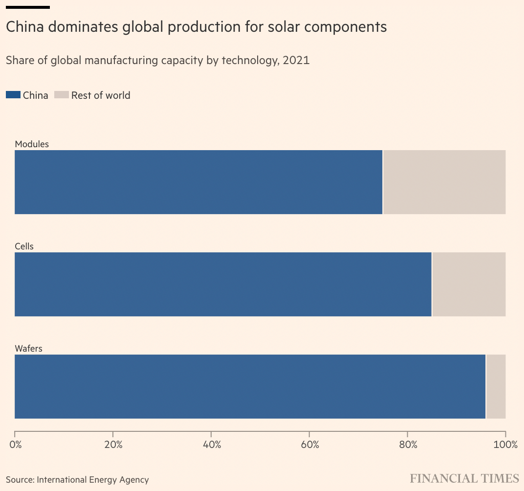 通過(guò)推動(dòng)美國(guó)制造產(chǎn)品,美國(guó)正試圖對(duì)抗中國(guó)在全球清潔技術(shù)供應(yīng)鏈中的主導(dǎo)地位。根據(jù)國(guó)際能源署的數(shù)據(jù),中國(guó)生產(chǎn)了世界上幾乎所有的硅片、85%的電池和四分之三的組件。中國(guó)也是世界上多晶硅的關(guān)鍵生產(chǎn)國(guó),多晶硅是太陽(yáng)能組件的關(guān)鍵原材料。