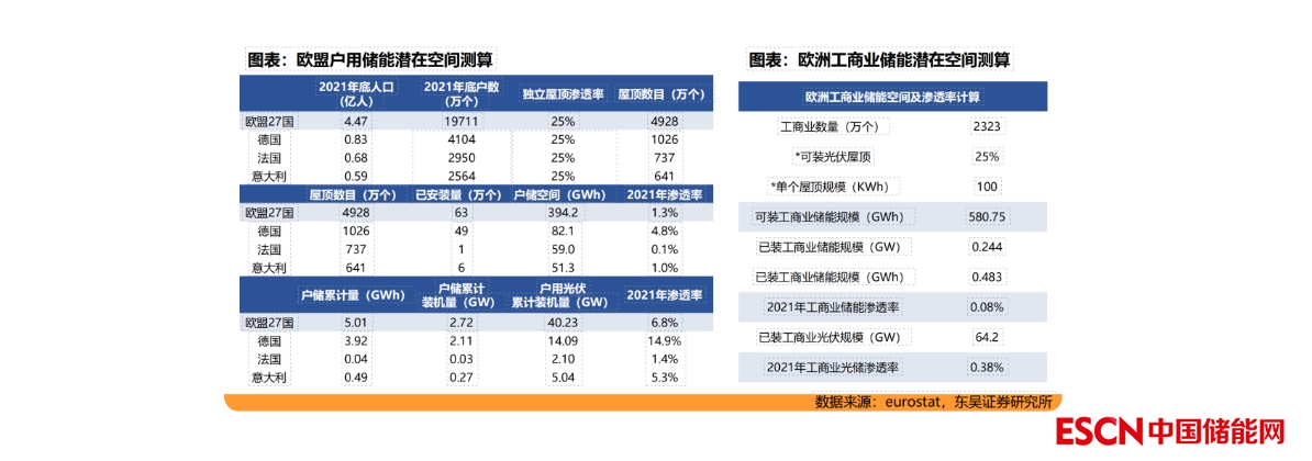 歐洲可開發(fā)光儲(chǔ)屋頂空間廣闊,戶用達(dá)394GWh,工商業(yè)達(dá)581GWh!戶用:根據(jù)歐盟統(tǒng)計(jì)局?jǐn)?shù)據(jù),2021年歐盟/德國有1.97/0.41億戶,假設(shè)25%的獨(dú)立屋頂(且適宜安裝),則歐盟/德國有4928/1026萬個(gè)可安裝光儲(chǔ)的屋頂,假設(shè)每戶平均10kwh,2021年歐盟/德國戶儲(chǔ)滲透率僅1.3%、4.8%,歐盟/德國戶儲(chǔ)仍分別有394.2/82.1GWh的可開發(fā)空間。工商業(yè):2021年歐洲共有2323萬工商業(yè)戶數(shù),假設(shè)25%的可裝光伏屋頂,每戶平均100kwh,歐盟工商業(yè)儲(chǔ)能有580.75GWh的可開發(fā)空間,截至2021年歐盟滲透率僅0.08%。