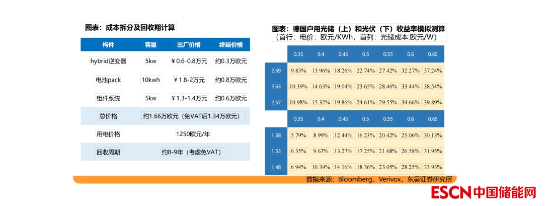案例:假設(shè)系統(tǒng)由5kW逆變器及10kWh儲(chǔ)能電池構(gòu)成,系統(tǒng)售價(jià)為逆變器、電池、組件及安裝費(fèi)用三者之和共1.66萬歐元,考慮到免除VAT后安裝價(jià)格為1.34萬歐元。據(jù)東吳證券測(cè)算得出,45歐分電價(jià)假設(shè)下德國戶用光儲(chǔ)系統(tǒng)即有18.3%收益率(考慮19%VAT退稅),回收周期為7-8年;若僅安裝光伏,IRR降至12.4%,回收期需13-14年??傮w來看,德國戶用光儲(chǔ)經(jīng)濟(jì)性十分強(qiáng)勁,我們預(yù)計(jì)未來隨著光儲(chǔ)系統(tǒng)成本的下降,戶儲(chǔ)需求將持續(xù)提升!