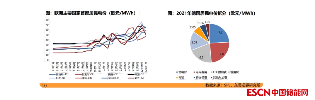 居民電價(jià)的上漲原因是售電價(jià)格的提高,德國通過減免稅費(fèi)以減輕居民負(fù)擔(dān)。以德國為例,德國居民電價(jià)由售電價(jià)格、電網(wǎng)費(fèi)用、EEG附加費(fèi)、電稅等費(fèi)用加總得出。2022年批發(fā)電價(jià)的上漲,推動(dòng)了居民電價(jià)合約價(jià)格的提高,2022年11月德國居民電價(jià)已達(dá)64.19元/MWh。此外,德國已于2022年7月取消EEG附加費(fèi),歐洲各國后續(xù)仍有可能逐漸減免或取消相關(guān)稅費(fèi),減輕居民端用電負(fù)擔(dān)。