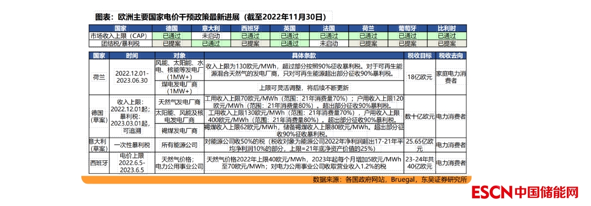 在歐洲邊際定價(jià)的模式下,電價(jià)大幅拉升,能源公司采購新能源電力的成本遠(yuǎn)低于售電價(jià)格,因而獲得超額利潤。在此背景下,歐洲推出兩項(xiàng)措施:1)180歐元市場收入上限(CAP):對(duì)可再生能源(太陽能、風(fēng)能、水電等)發(fā)電公司,在2022年12月1日至2023年6月30日期間,市場收入設(shè)置了上限,為180歐元/MWh;2)暴利稅/團(tuán)結(jié)稅:對(duì)不可再生能源(石油、天然氣、煤炭等)發(fā)電公司,任何在2022-2023年實(shí)現(xiàn)的超額利潤都將至少繳納33%的稅收。根據(jù)歐盟,團(tuán)結(jié)稅的收益應(yīng)流向能源消費(fèi)者、能源密集型公司等。