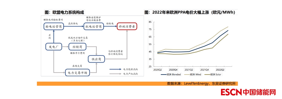 發(fā)電廠的電力一部分通過PPA電價(jià)售出。發(fā)電廠通過購電協(xié)議(PPA) 鎖量鎖價(jià)的形式與下游能源供應(yīng)商簽署10-20年的電力供應(yīng)合約。2022年因歐洲能源緊缺、批發(fā)電價(jià)大幅上漲,PPA電價(jià)也呈現(xiàn)出上漲趨勢(shì),2022Q3平均光伏PPA電價(jià)為68.6歐元/MWh,同環(huán)增53.1%/14.7%,平均風(fēng)電PPA電價(jià)為73.5歐元/MWh,同環(huán)增50.9%/11.1%,能源危機(jī)下,電力發(fā)電廠收益顯著提升,加大新能源開發(fā)力度。