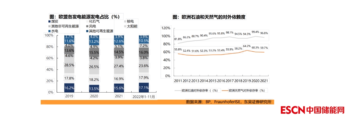 2022年可再生能源替代加速。2022年能源危機(jī)下,以光伏為首的可再生能源經(jīng)濟(jì)性凸顯,滲透率加速提升。截至11月底,太陽能占?xì)W盟發(fā)電能源自2021年的5%提升至7%,提升2.1pct,風(fēng)電自2021年的14.5%提升至16%,提升1.5pct。