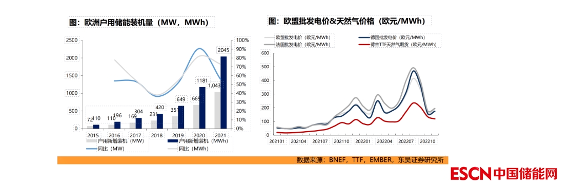 2022年歐洲能源危機(jī)、電價(jià)高漲,歐洲戶儲(chǔ)需求旺盛。2022年受俄烏沖突影響,俄羅斯天然氣供應(yīng)大幅減少,導(dǎo)致歐洲能源價(jià)格飆升,進(jìn)而推動(dòng)歐洲批發(fā)電價(jià)一路上漲,歐盟月均批發(fā)電價(jià)最高點(diǎn)超400歐元/MWh,較21年同期增長達(dá)346%。在此導(dǎo)火索下,歐洲戶用光儲(chǔ)高經(jīng)濟(jì)性得到市場的認(rèn)可,光儲(chǔ)需求開啟爆發(fā)式增長,我們預(yù)計(jì)2022年歐洲光伏達(dá)50GW以上,實(shí)現(xiàn)翻倍增長,歐洲儲(chǔ)能達(dá)13GWh左右,同增三倍。