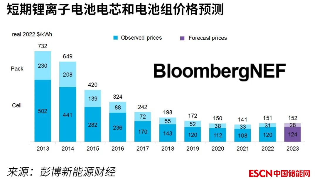 彭博新能源財(cái)經(jīng)對2023年容量加權(quán)鋰離子電池組價格的預(yù)測